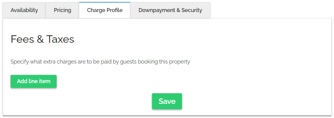 Whenever you enter Charge Profile in the Advanced settings, it will always look empty. Charges you currently have on the individual property level will be entirely replaced by the settings that you are about to define. If you wish that the selected properties have an identical set-up of charges, you can define now the first element for the selected properties.