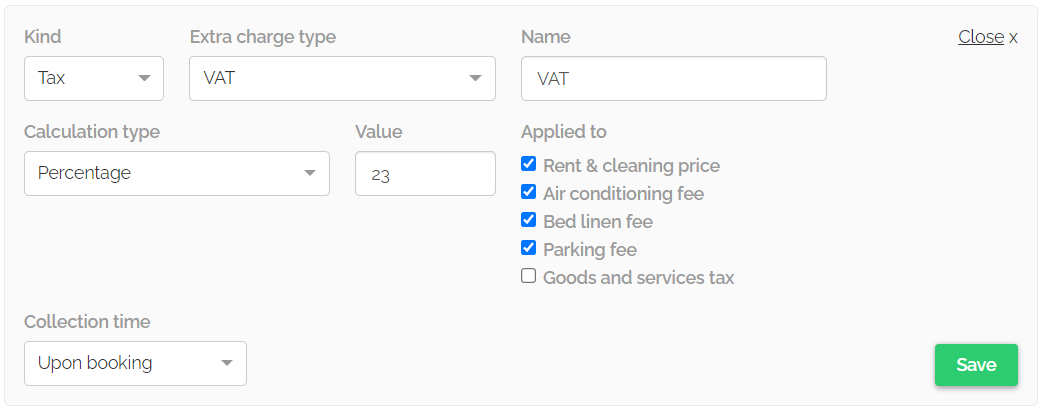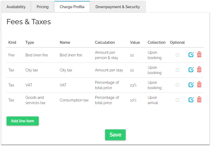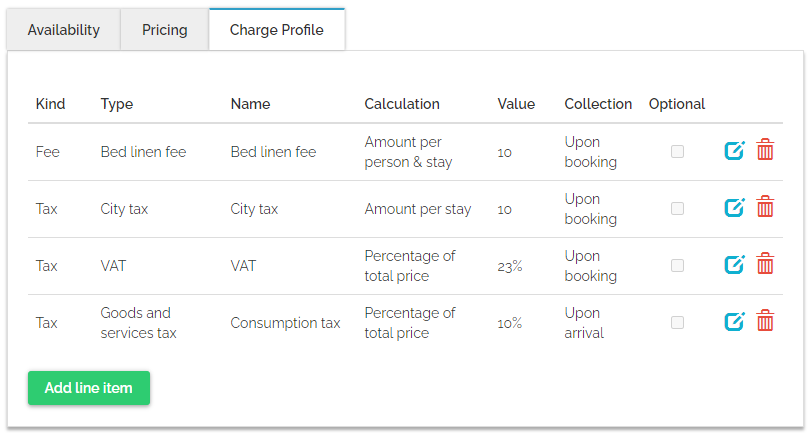 Charge Profile refers to additional types of charges that can be specified in Rentals United in great detail. The values in Charge Profile are sent to the Sales Channels, as some display them separately for the guests, as well as are used to insert reservations into PMS with correct tax and fees details.