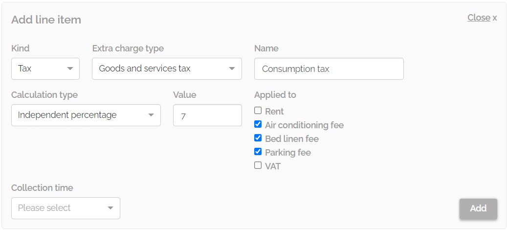 Example: As can be seen in the screenshot, the GST value (7 %) is calculated on the basis of the flat fees, except rent and VAT.Tip: Note that percentage charges must be applied to at least one item (rent, fee or tax)! Otherwise, you will be prompted with an error.Important: Charges of specific calculation follow some restrictions. Check out the mappings that are not supported: