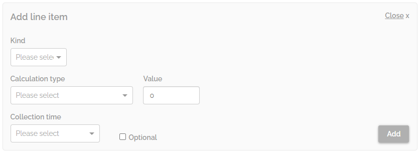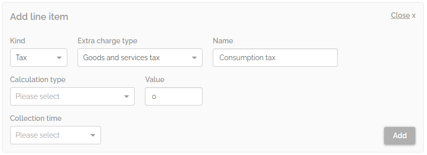 Click the Add line item button and follow the steps described in Setting taxes and fees.