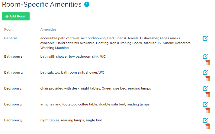 Vrbo accepts not only the list of amenities available for the property, but also amenities available for each room. There are, however, some limitations, as each room accepts only a specific set of amenities. Hence, any amenity cannot be selected for any room. Not accepted amenities will be transferred to Vrbo as a part of the General section.