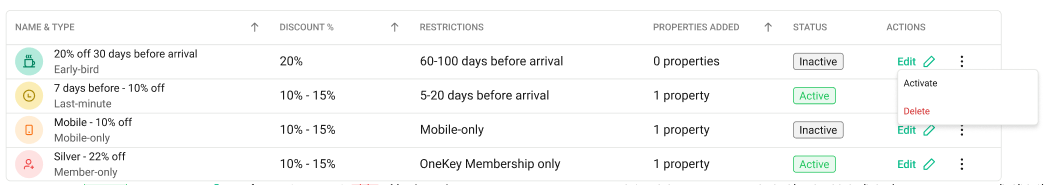 Inactive - The discount is not synced with the channel and is not applied to any property