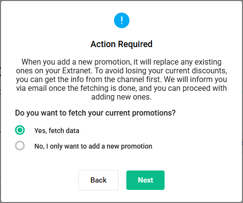 The data is being synchronised from the channel and it may take a while. After the fetching is complete, we will send you an email notification. While fetching the data, you cannot add a new discount.