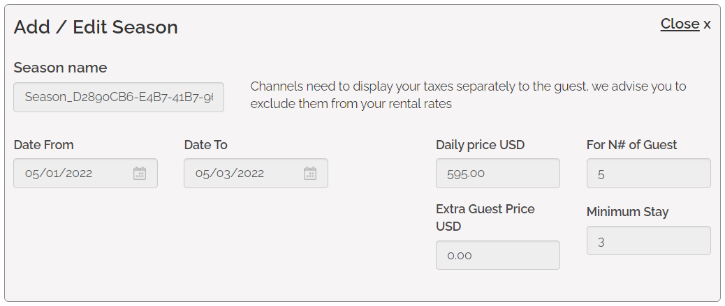 The season refers to a period of time when particular pricing is applied. It is possible to set as many seasons as required, varying in length and specification. The minimum settings require: