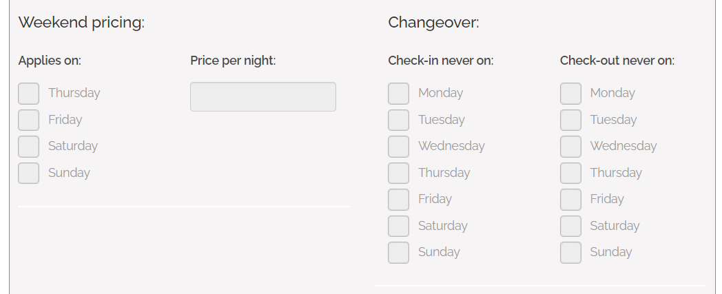 Changeover restrictions specify whether check-in or check-out is allowed for a given day. This is a great option if you need the guests checking in and out to fit your schedule and it will help you avoid unexpected guests. If some days are restricted from changeovers, then your guests will simply not be able to select such a stay if the start or end day falls on a changeover-restricted day.
