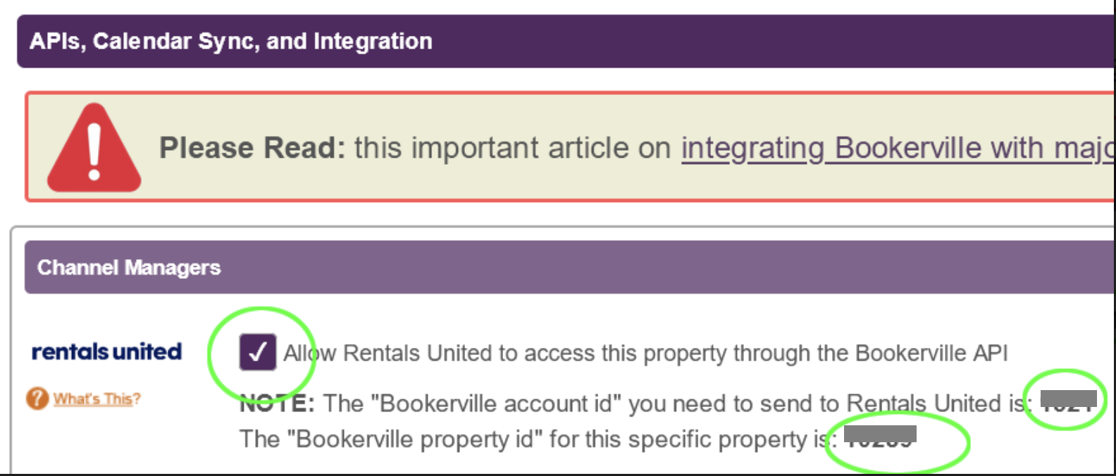 In Bookerville, go to the main Property setup tab, navigate to the APIs, Calendar Sync, and Integration section, where Rentals United is listed as the top option. You will have the option to mark (or unmark) the checkbox to make the property visible or hidden on the Rentals United API. Both the Bookerville account ID and the property ID are presented there, although, for Rentals United integration, the account ID is primarily required: