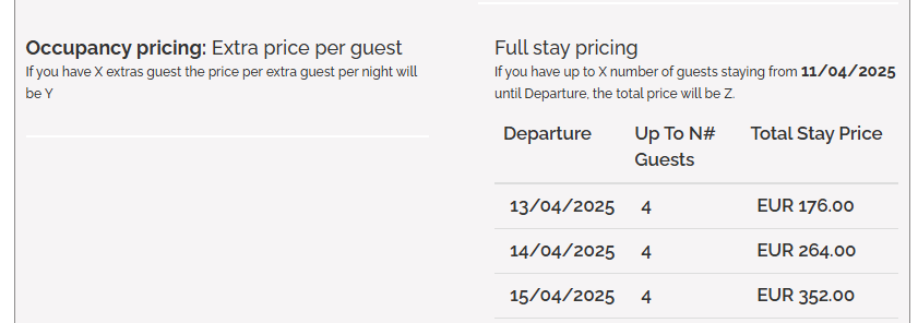 Standard number of guests refers to the maximum number of guests included in the Daily price for whom the price does not change. If more guests than specified book a stay, the extra guests will be charged with the price set in the Extra guest price element.