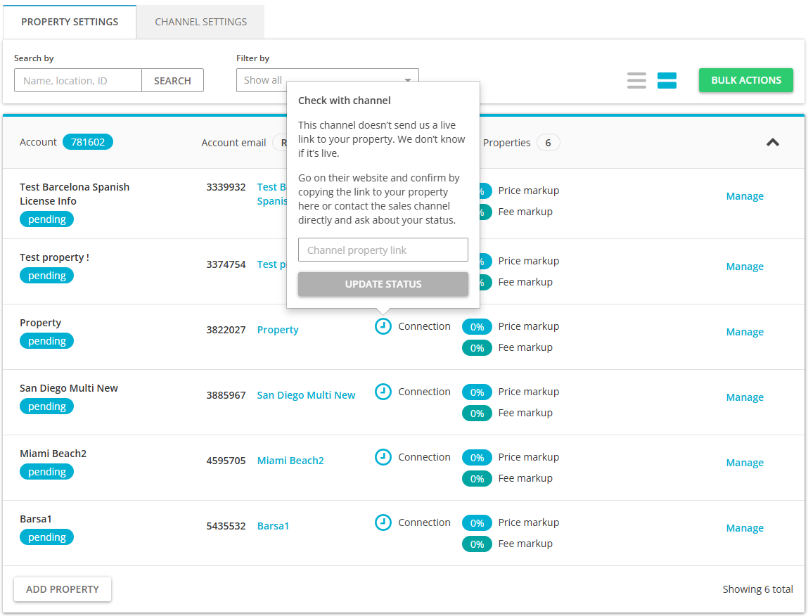 Tip: You can hover over the icon and provide the listing URL in the text field. The listing URL is the link to the listing of your rental in this particular sales channel. Note that pasting this URL is not mandatory, as the connection in Rentals United is live without it. If only you find the status annoying, you are welcome to paste the URL. However, if pasting the URL does not resolve the issue, you should contact the sales channel as soon as possible.Note: If the Pending status does not update after few days automatically, please contact the Rentals United Support Team.