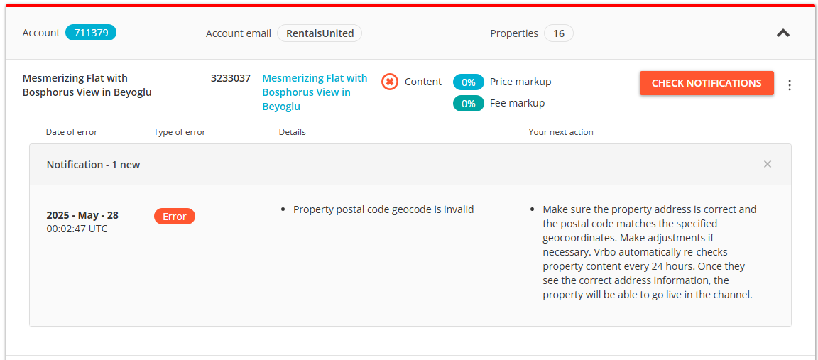 Error - displayed when there appeared critical property descriptive content synchronization or availability and rates synchronization error and the connection has been severely impacted e.g. a listing has not been created or updated in the channel. You can expand the section and perform the suggested actions to clear the errors.