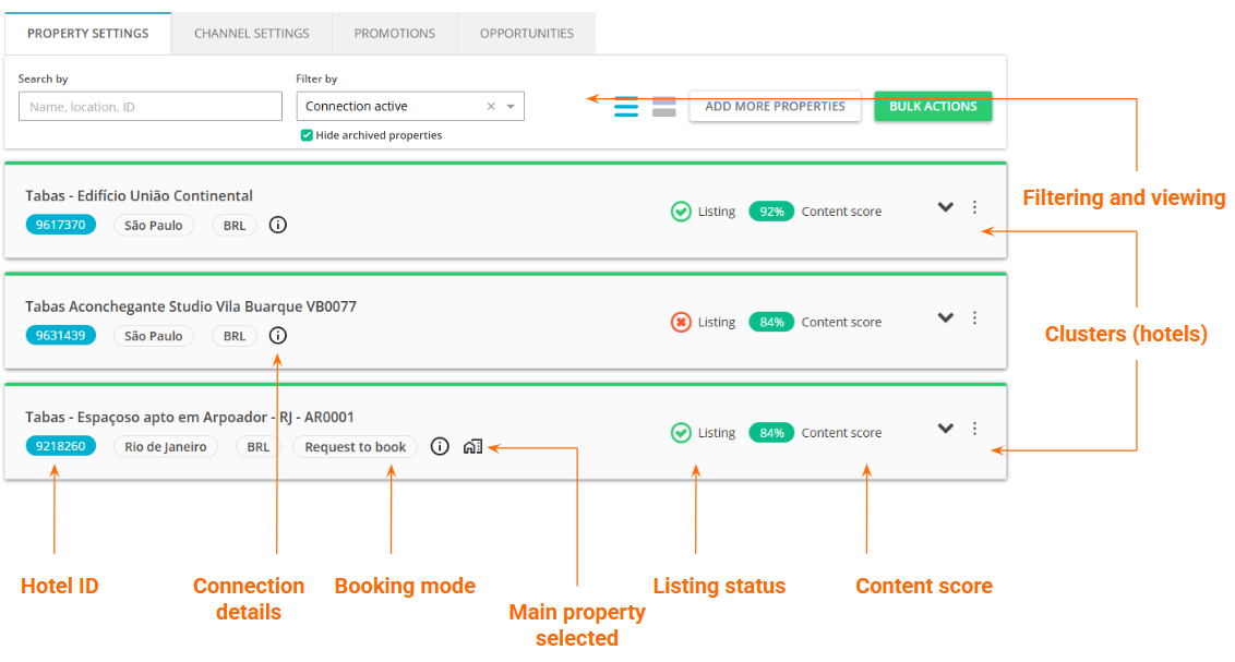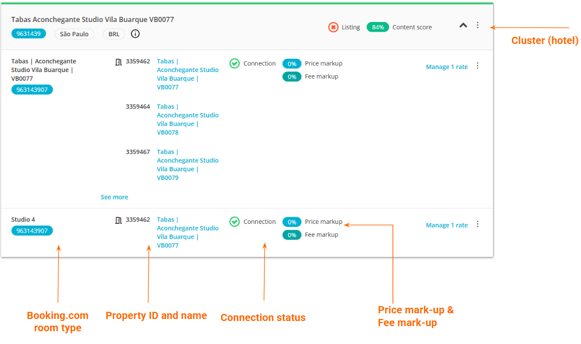 In Booking.com Property Settings, each hotel is represented by an individual cluster. The hotel clusters present the details about the hotel and its set-up.