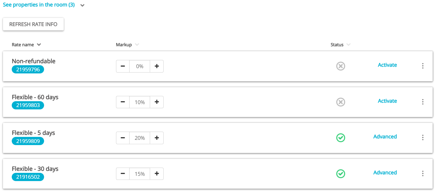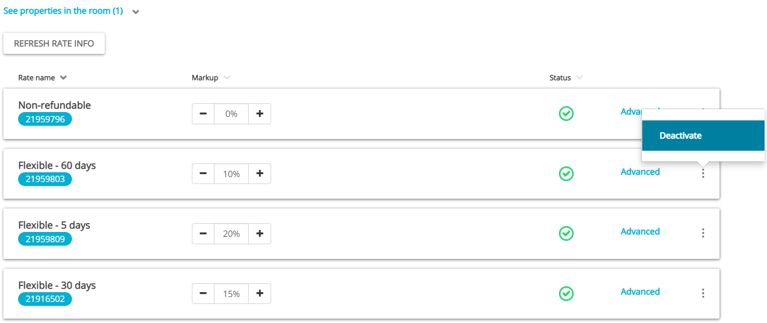 After mapping, remember to activate the connection by clicking the Activate button next to each rate in Property Page. If you decide to deactivate the rates, you can always do this by clicking the Deactivate button which is available after you click the Manage button. Note, however, that depending on the status of other rates or the channel policy, deactivation's results may be different, so be careful with that. Also, deactivation does not remove the connection between Rentals United and the sales channel, so you will be able to activate the connection back any time.