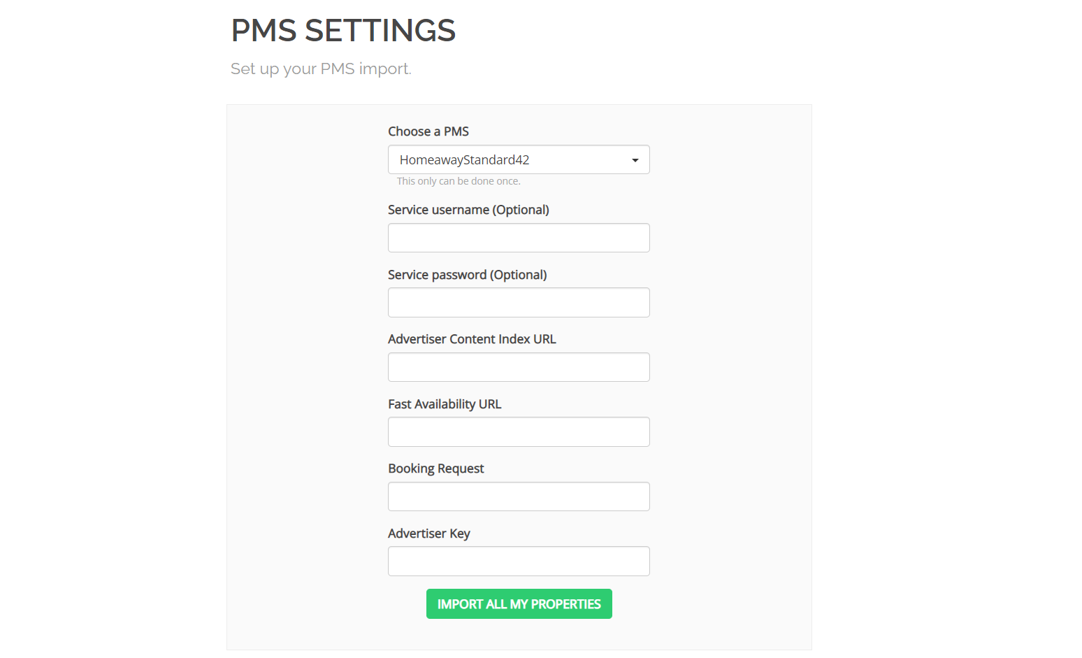 Click the Import all my properties button. All properties that fulfil Rentals United requirements to connect will be now imported from PMS into your Rentals United account.