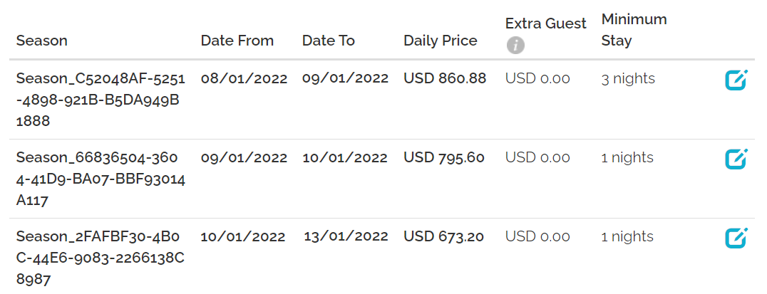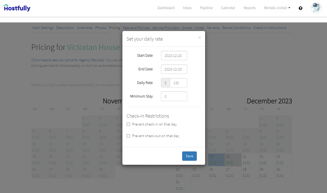 In Hostfully: Rentals United > Pricing > Select the date > Daily Rate In addition to that, you can modify prices for individual days. If these are specified, they will overwrite the base price and weekend adjustment rate. |