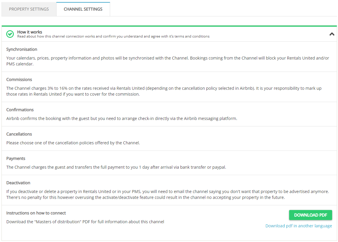 Remember that the charging options of a specific channel can be checked if you go to Rentals United > Services > My services > Sales Channel > Property settings > Channel settings > How it works > Payments. See the below example.