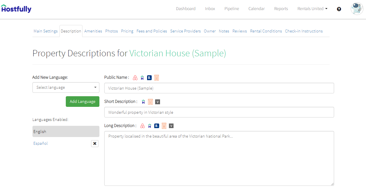 Description is the summary of all information about the property that might be useful for the guests. It may be accompanied by translation in different languages.