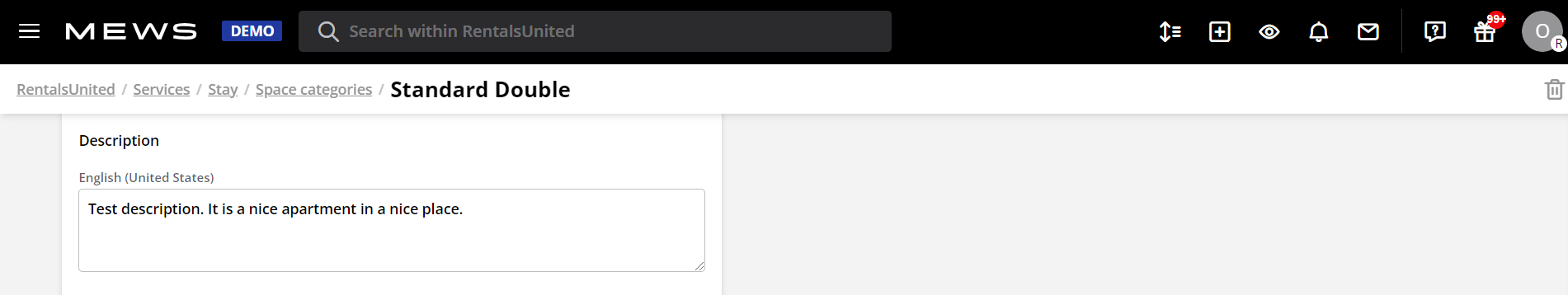 MEWS provides only one description to Rentals United. For the best performance, we recommend to provide English description in MEWS. Then, the English description will not be editable in Rentals United, but you will be able to add descriptions in other languages manually in Rentals United.