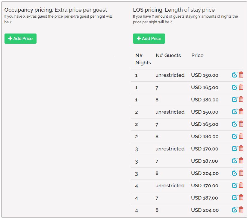 In case you use LOS pricing, you can easily set that one guest pays a different amount per night, depending on how many nights were booked. For example, 1 guest can pay 200 per night if a 3-night stay was booked - the total is 600 USD. But you can easily set that 1 guest can pay 190 USD per night if a 4-night stay was booked - the total is 760 USD.