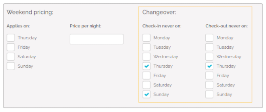 Changeover restrictions specify whether check-in or check-out is allowed for a given day. This is a great option if you need the guests checking in and out to fit your schedule and it will help you avoid unexpected guests. If some days are restricted from changeovers, then your guests will simply not be able to select such a stay if the start or end day falls on a changeover-restricted day.