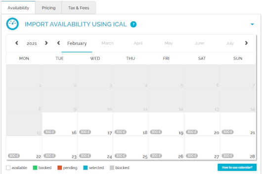 Calendar stands for the property's availability to rent. You can check here the availability of your property in the selected time frames. Once a reservation is inserted in Rentals United, the availability in the calendar gets blocked for this period. The calendar is updated automatically every time the availability of the property changes or at predefined times to remain up-to-date.