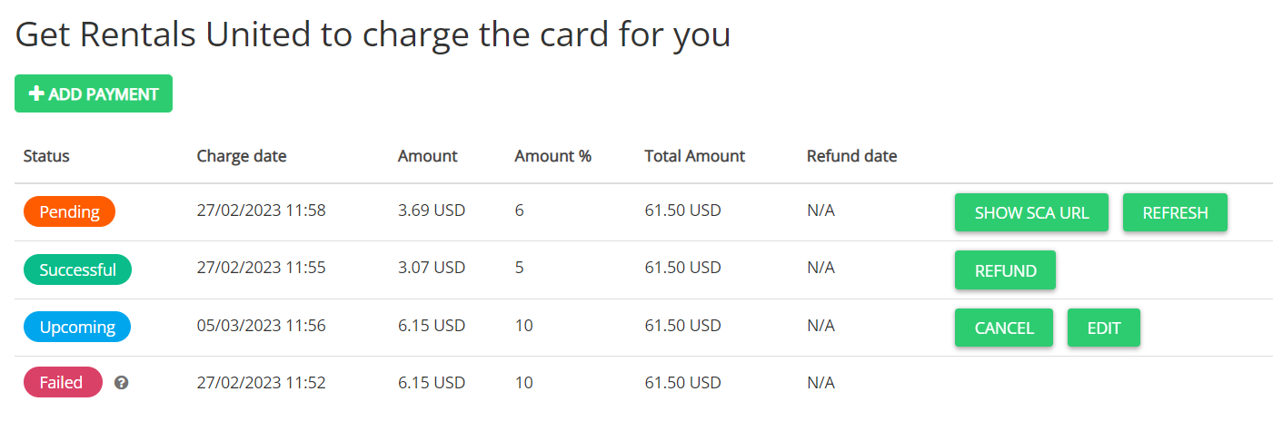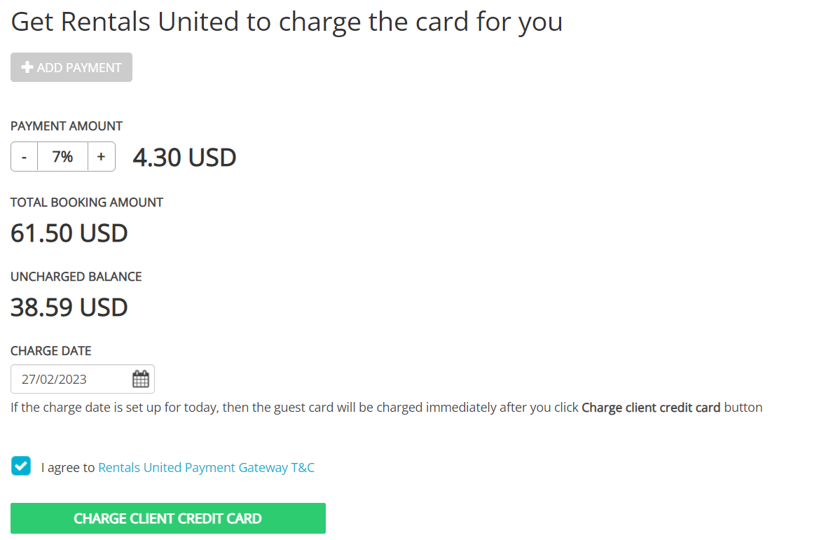 You can see the Get Rentals United to charge the card for you caption. Click Add payment button. If you cannot see it, it means that you have not yet connected to the payment provider that supports this feature (for example Stripe).
