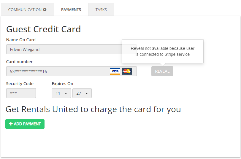 Revealing the card details: The option to reveal the credit card details is unavailable for users connected to Stripe. You will see an inactive button with the following notification: "Reveal not available because use is connected to Stripe service".