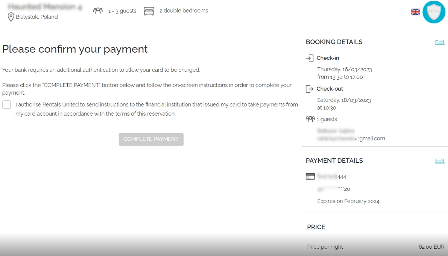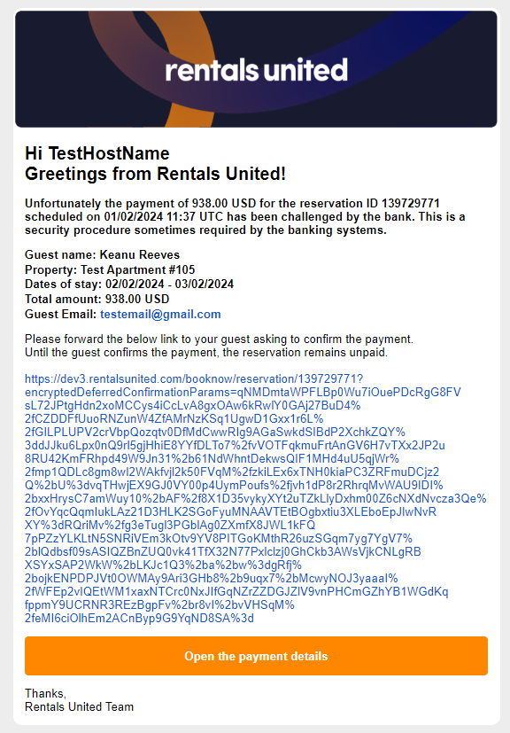 If the payment has been challenged by the SCA, you will also receive a notification to your email address and find there the same authentication link. Please, forward the link to your guest and ask to authenticate the payment.