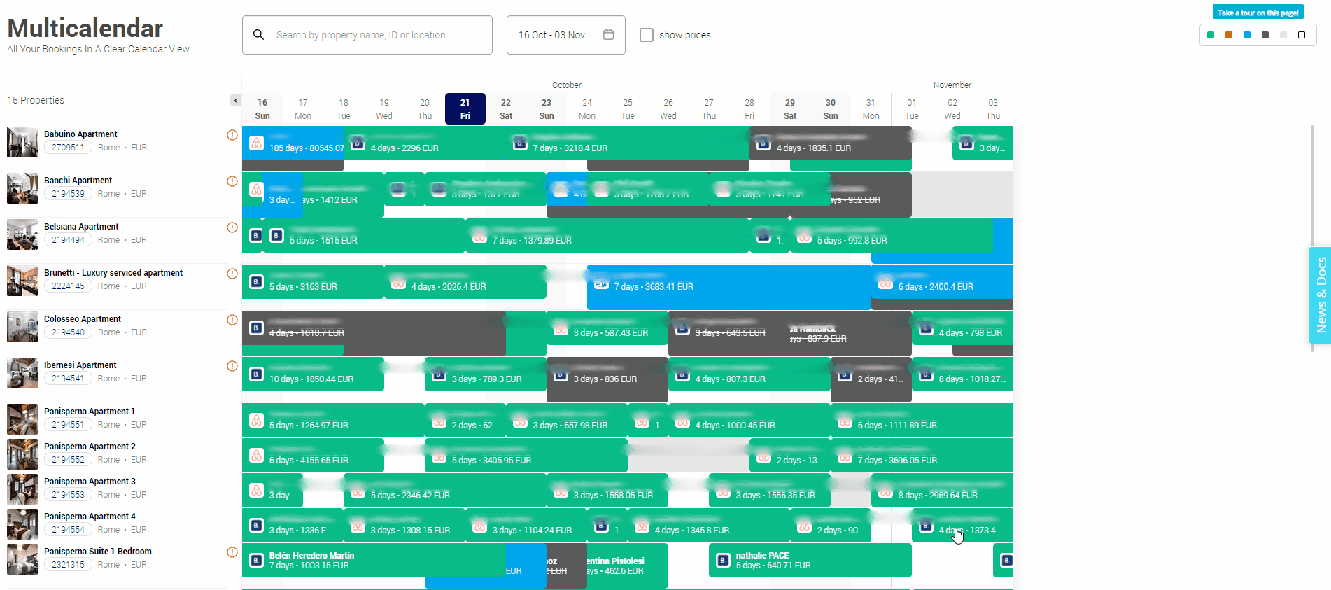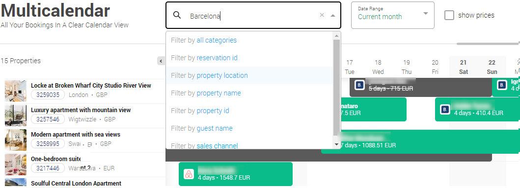 Multicalendar gives you a broader perspective onto all your bookings within a given time range. It is a more general view, which allows you to quickly get a hint of what is currently going on in your properties. On the other hand, Guest Planner provides you with the management functionalities. In Multicalendar, you can also select specific reservation and open it via Guest Planner.