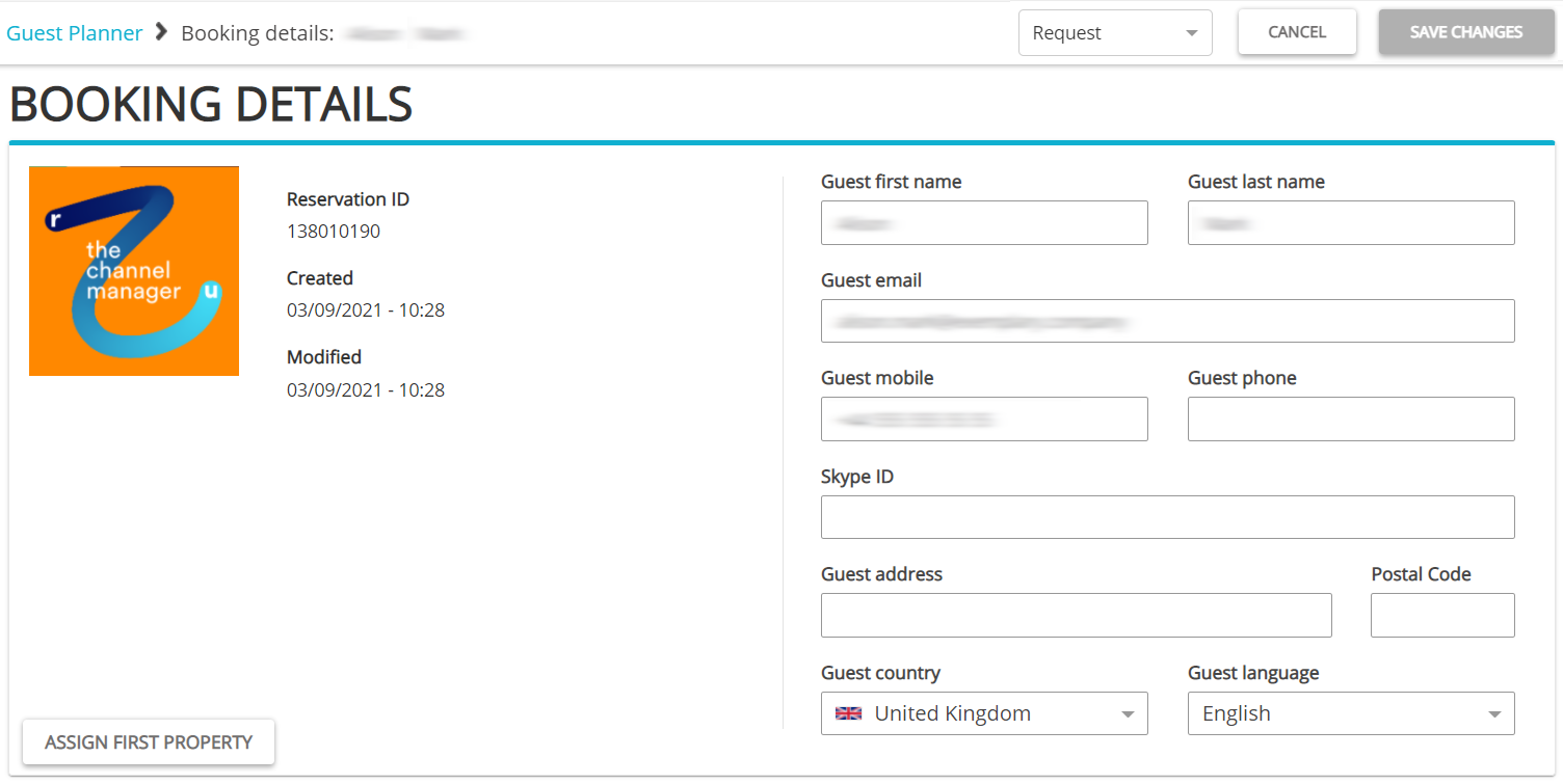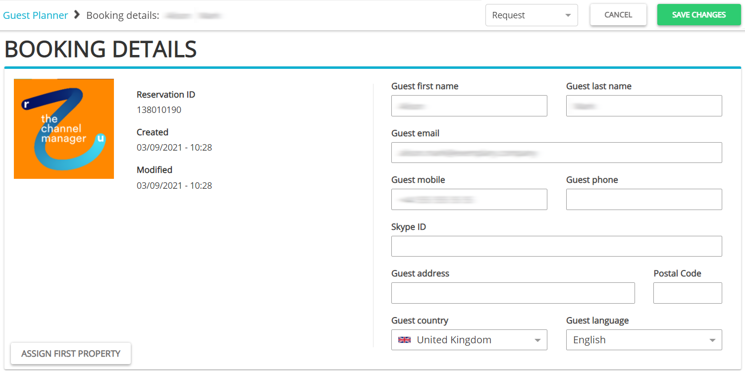 Click the Edit booking button in the top bar. You will notice that the Booking details slightly changed. You can provide additional guest details, if needed. Click the Assign first property button to select a property when your guests will stay at.