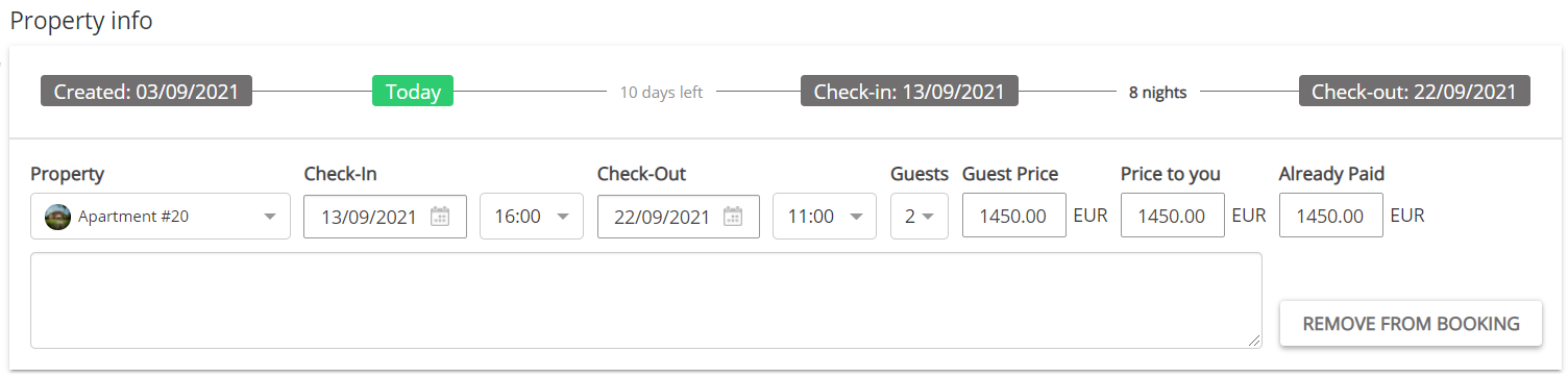The Property information section is opened. Fill in the details of the property your guest will be staying at. Select the property from the dropdown list, select the dates and provide the number of guests. The reservation price will be calculated based on the property prices introduced in Step 5: Price and availability.