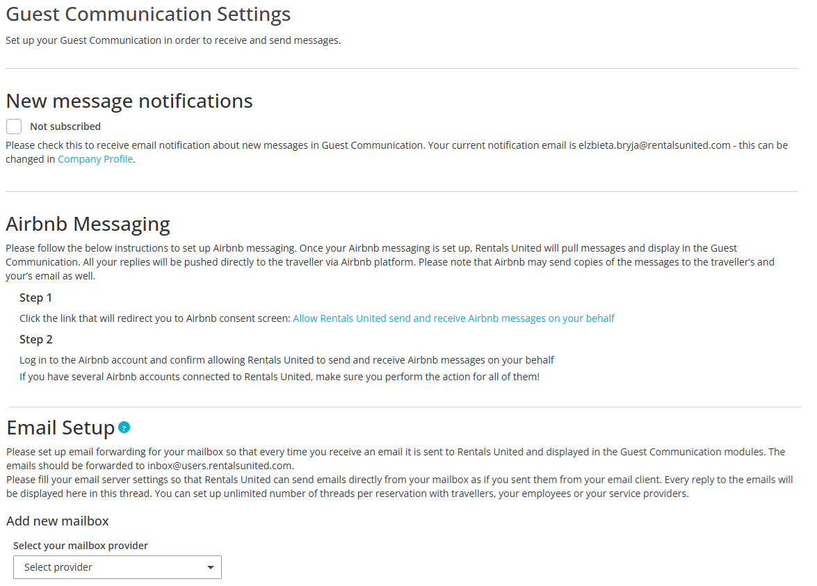 You can visit Control Panel in Rentals United and preview your settings in the Airbnb Messaging section. If you have no properties connected to Airbnb, you will see a message prompting you to connect to Airbnb and add your properties first. Once you have at least one property listed on Airbnb via Rentals United, the Airbnb Messaging section contains the instructions to allow Rentals United to send and receive messages on the Airbnb behalf.