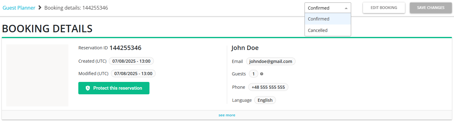 Update the guest details or the property information. You can also change the status of the reservation to Confirmed or Cancelled.