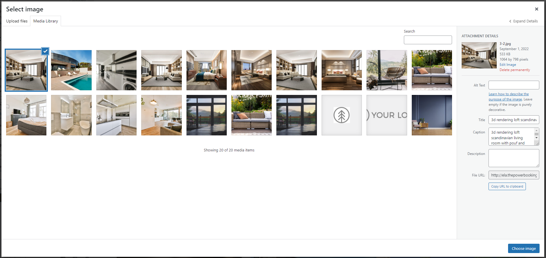 A new window opens. If you uploaded any images before, you can find them in the Media library. Otherwise, switch tabs to Upload files and browse your computer. Select the logo and click Choose image in the bottom right corner.