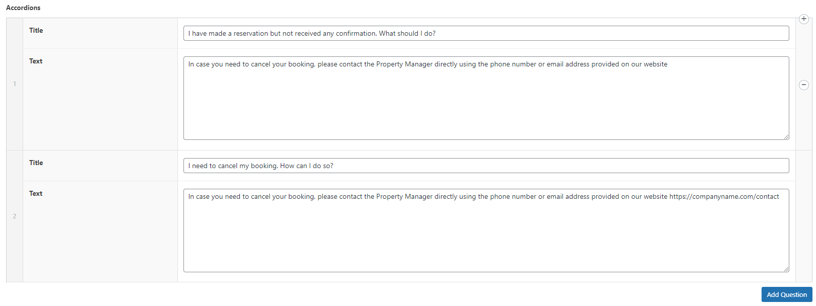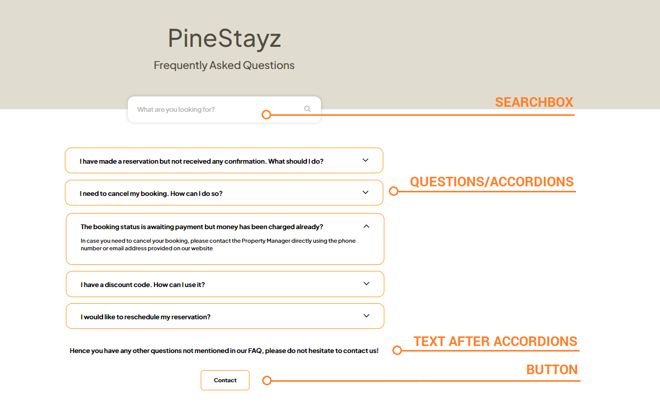 It is possible to place an additional button at the very bottom of the FAQ page. You may use it to redirect your guests to you main company website, homepage, FAQ or many more. Just make sure that the button is logically related to Text after accordions.
