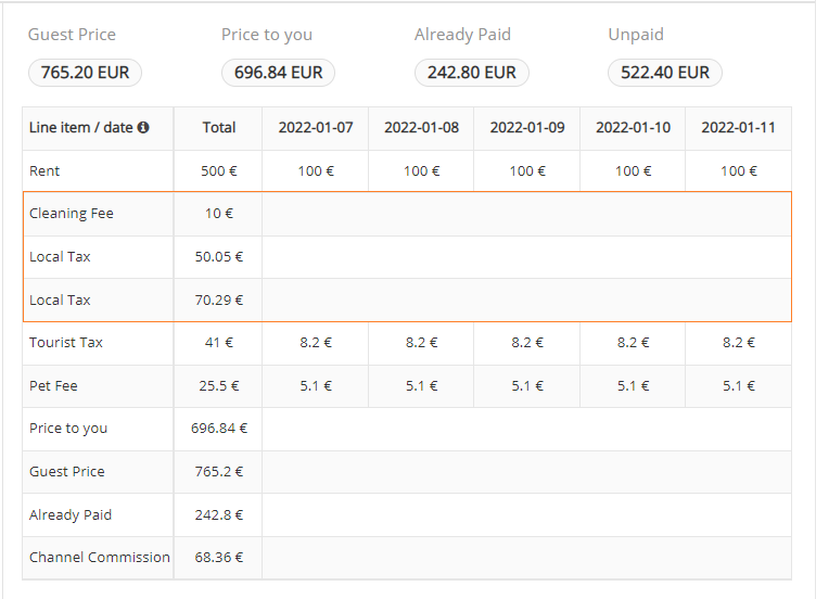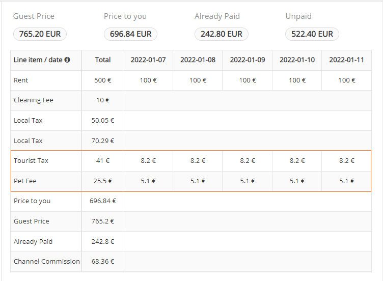 Charges applied per night are broken down into daily values. As can be seen in the screenshot below, the tourist tax and pet fee values are calculated for each day separately.