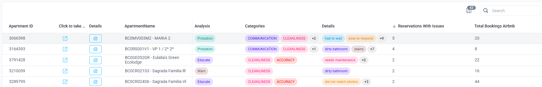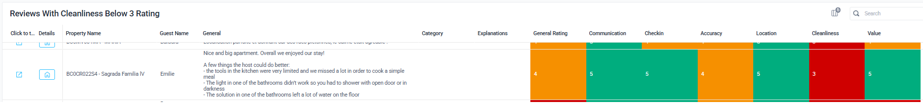 The Details column provides you with additional information, if available. For example, below you can see listings with the reported Cleanliness issues, which had additional details reported as well: dirty bathroom, needs maintenance, stains.