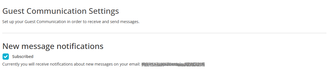 You may subscribe to receive email notifications with new messages from your guests by ticking the checkbox in the New message notifications section. Once you subscribe, email notifications will start flowing into your notification email set in Rentals United. By default, it is your Rentals United username, but you can change it in your Company profile.
