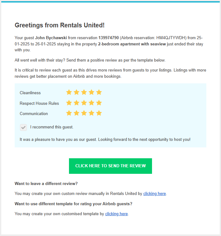 - Immediately after the check-out day, you will receive an email message with a suggested review and positive rating of your guests.