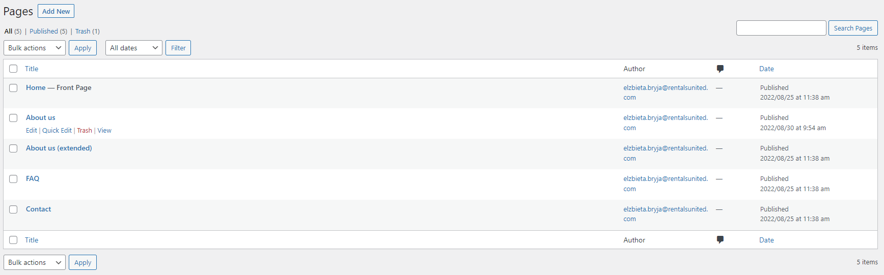 You can see now all the pages created for your website. Hover over Contact page. Management options appear: Edit, Quick Edit, Trash, View. Click Edit.