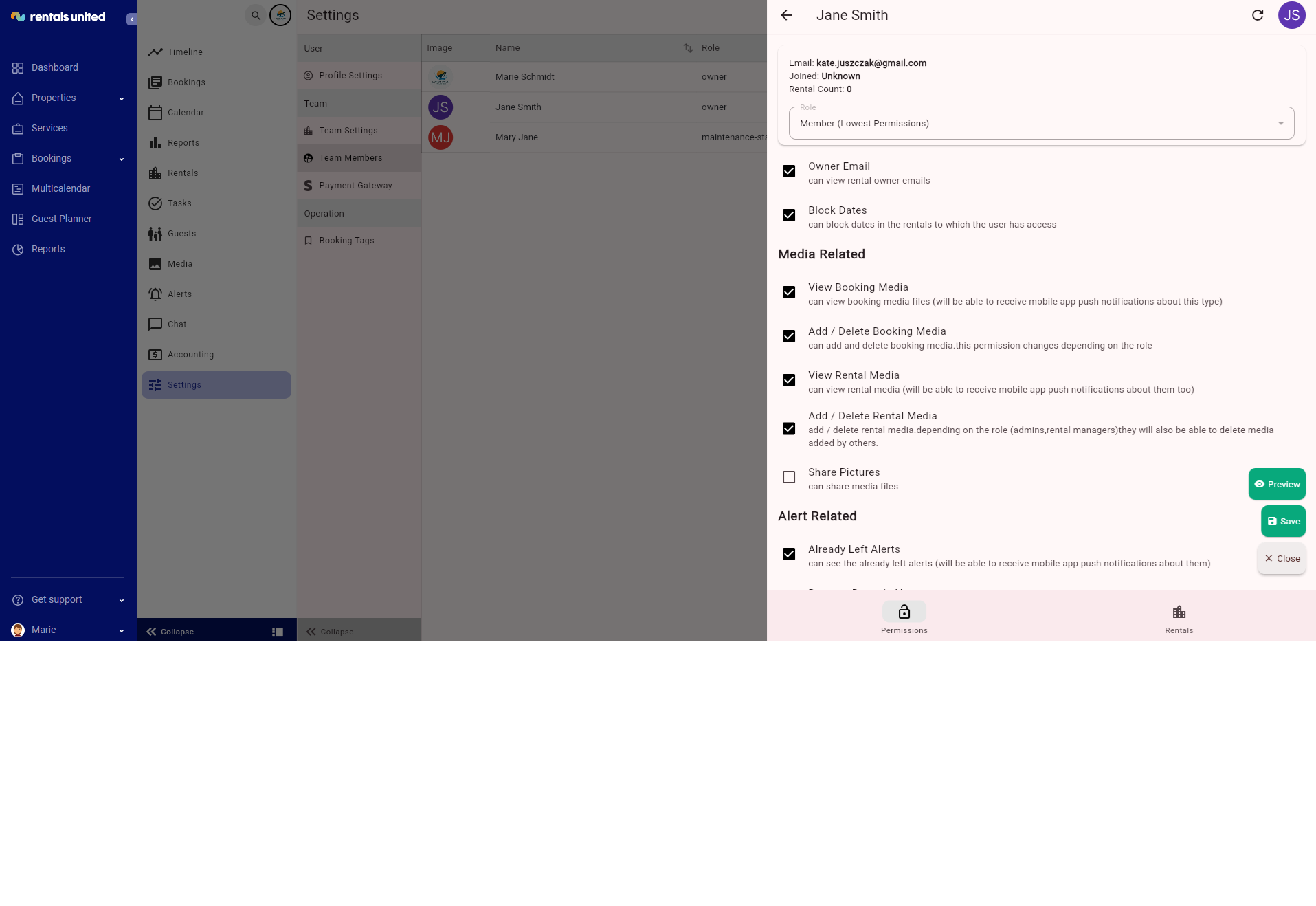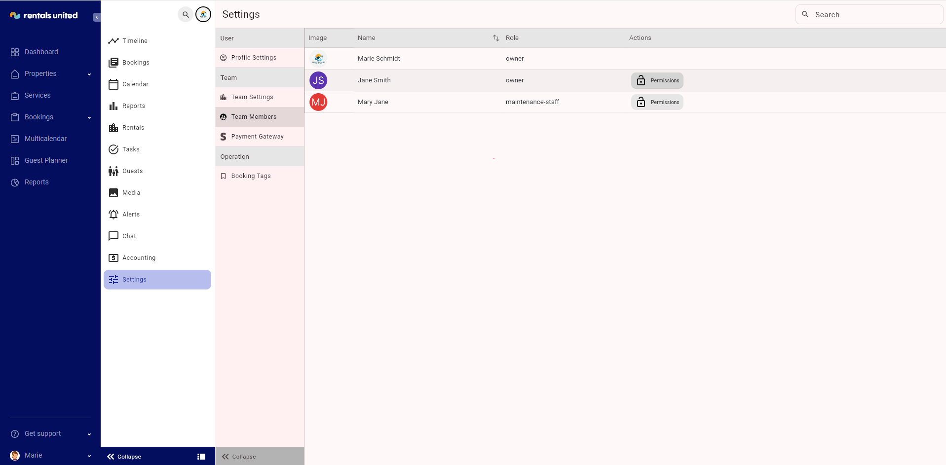 For example, you need the cleaning staff manager to have access to all the properties and accounting. Also, if you want the property owner to view only properties owned by him. So you can adjust their permissions the Teams permissions tab.