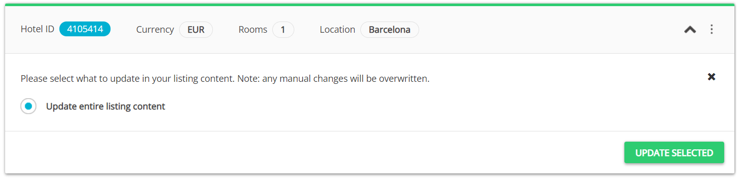 Remember that price and availability (ARI) updates are handled automatically and there is no need to update the listing if you change e.g. prices. The details that require updating the listing are static data updates and these include descriptions, photos, property data, fees and taxes and more. For details, see here.