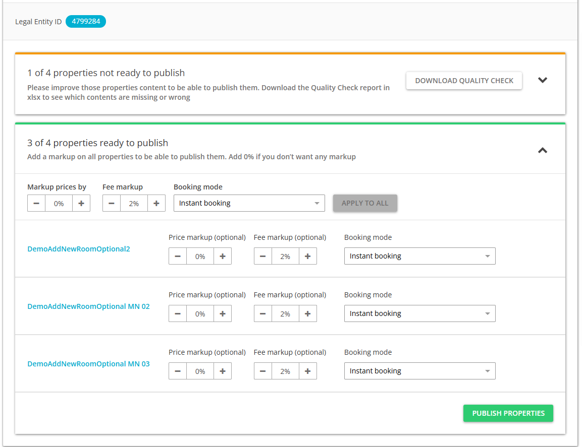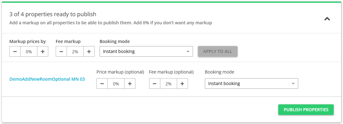 If the properties are ready to publish, adjust the mark-up for each of your properties. You can additionally set up the booking mode for each property: Instant booking or Request to book. See here.