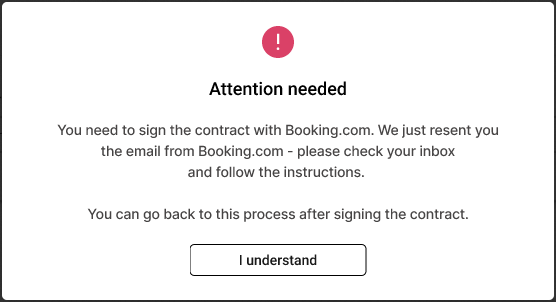 In case you have a Booking.com account, but you have not signed a contract with Booking.com yet, an email with the contract is sent to you. We will deliver the email to the address used for the registration in Booking.com and you will be notified about it in the pop-up.