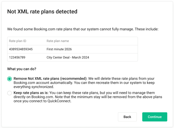 - Remove not XML rate plans (recommended): We will remove these rate plans from your Booking.com account automatically. Take note of the rate plan details and room types they are added. You will be able to recreate them later in Rentals United - follow the steps here.
