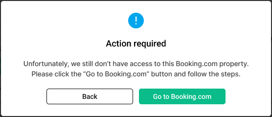 There may be a small delay in the communication from Booking.com to Rentals United. If you followed the steps in Booking.com and gave us access, but still see the no-access pop-up, try clicking the Done button again after waiting a couple of minutes.