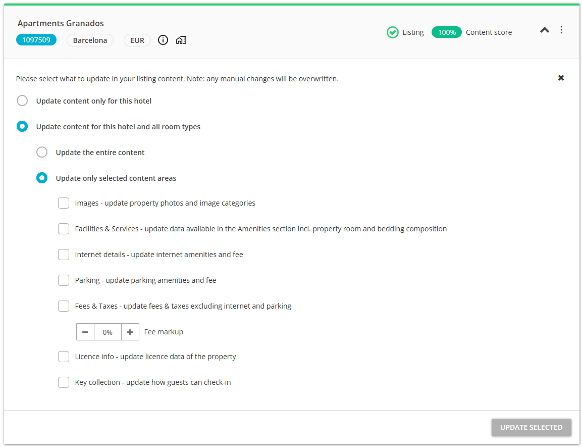 Listing content updates are sourced on the main property selected for a hotel and/or room type. You have multiple update options to choose from.