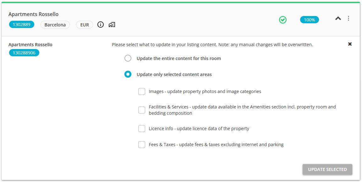 If you want to perform a full update, select Update the entire content. If you select this option and have additional content for this property in sales channel extranet, then it may be overwritten. If you manage your property content solely in Rentals United, then you can safely use it.