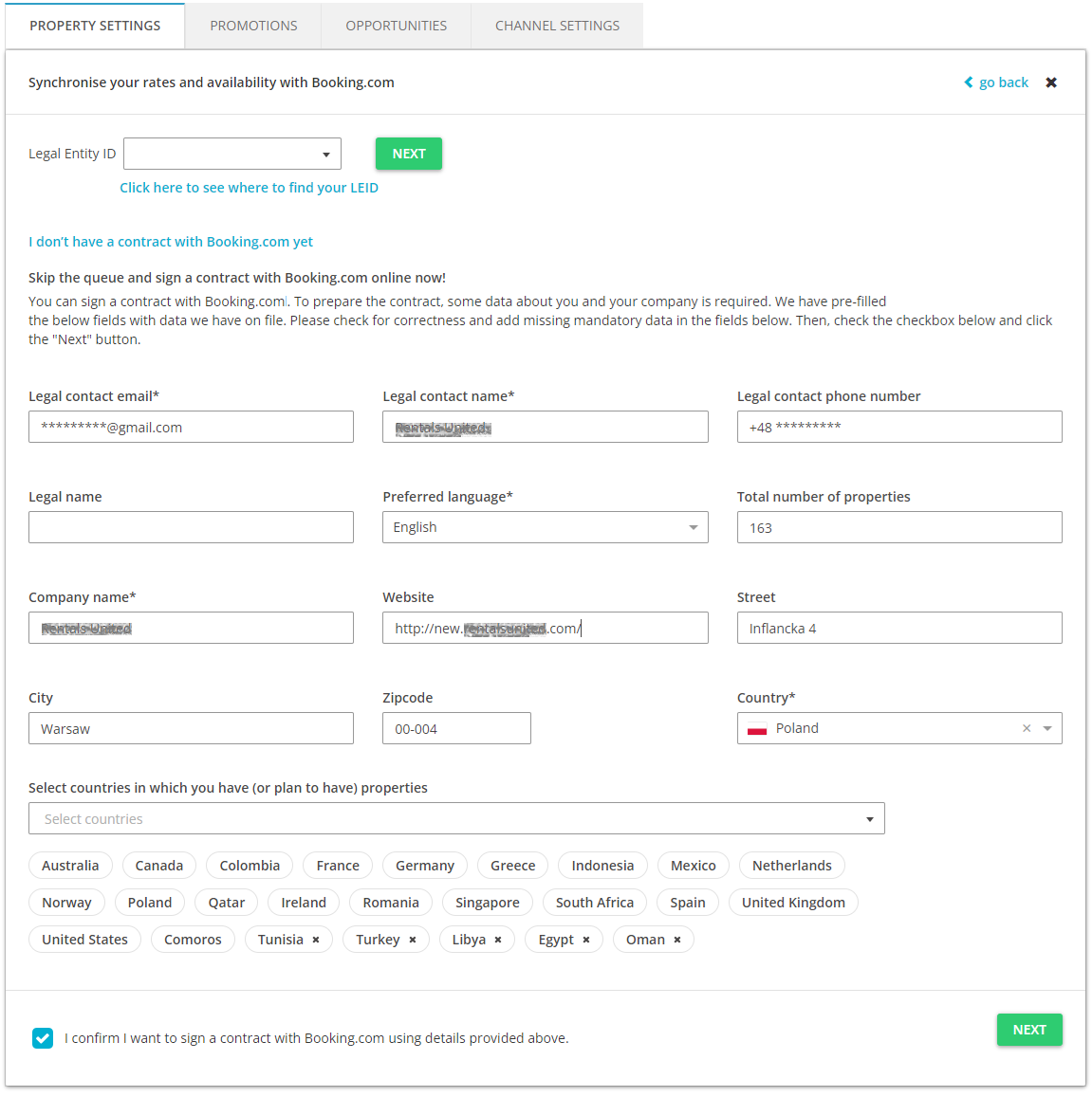 This procedure works only if you do not have any existing contract with Booking.com. If you already have a contract with Booking.com and you only want to add additional countries to your contract, you should follow the instructions here.