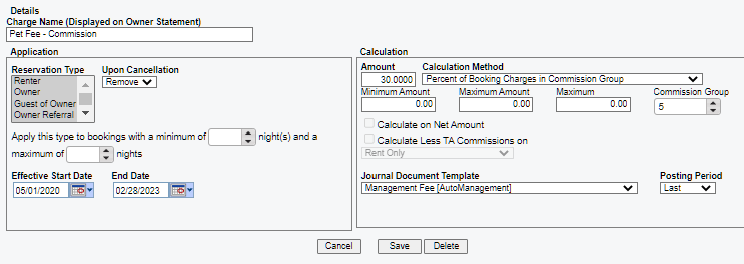 Go to the Owner Contract Template in Escapia. This is the owner contract template that charges a commission to the owner on different charges. The client have to add this to every owner contract and go into every reservation to recalculate the fee.