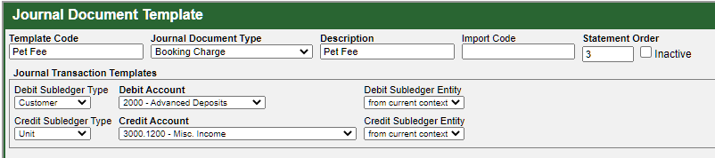 Open the Journal Document Template in Escapia. This setting is responsible for making the pet fee a part of the income for the unit.
