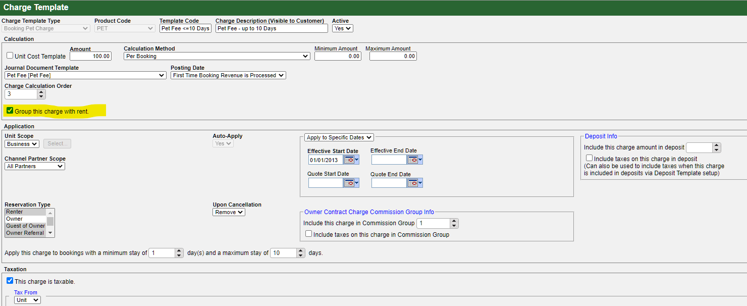 Open the Charge Template in Escapia. This is the template that groups the fee with rent and sets the conditions for charging the pet fee. Make sure that the Group the charge with rent option is selected for the pet fee.